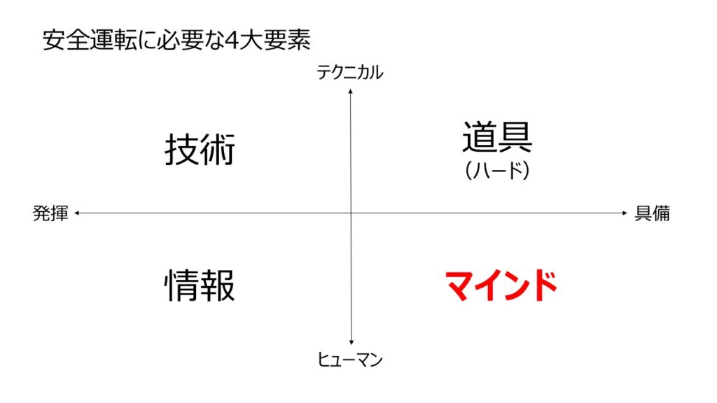 私はこれまで、自動車による事故を防止するコンサルタントとして「安全運転には4つの要素が必要だ」と提唱し続けてきました。それは「技術」「道具(ハード)」「情報」「マインド」です。幸いなことに、これまで多くの専門家のみなさんやドライバーの方々にこの持論をお伝えしてきましたが、幸い納得感を持って受け入れられ、一度も否定されたことはありませんでした。